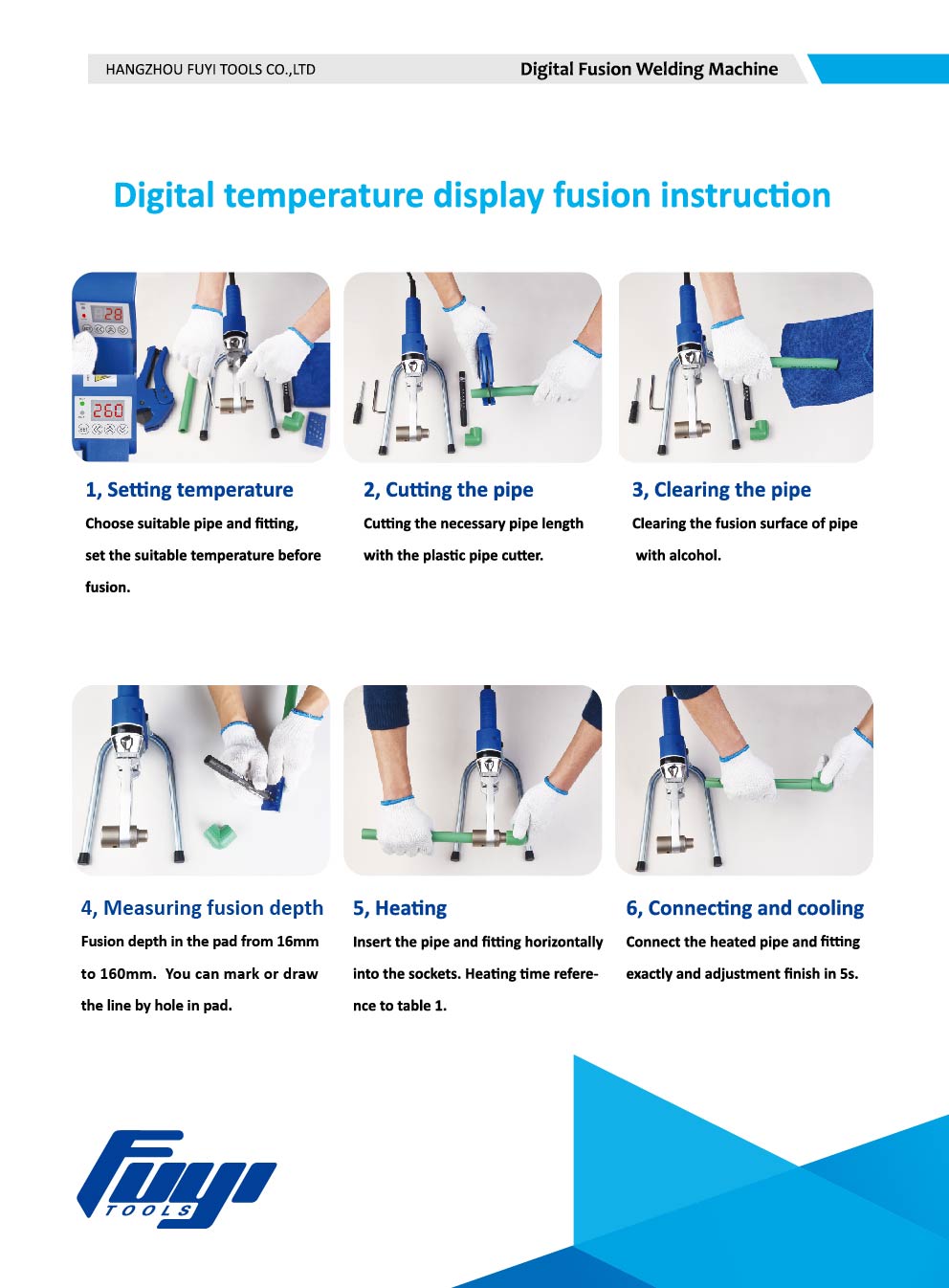 Cum se utilizează aparatul de sudură prin fuziune cu prize digitale 1. Setarea temperaturii Alegeți țeava și fitingurile potrivite, setați temperatura potrivită 2. Tăierea țevii Tăierea lungimii necesare țevii cu tăietorul de țevi din plastic. 3. Curăţarea conductei Curăţarea suprafeţei de topire a conductei cu alcool 4. Măsurarea adâncimii Fusion Adâncimea Fusion în pad de la 16mm la 160mm. Puteți marca sau desena linia cu gaura în pad. 5. Încălzire Introduceți țeava și racordul orizontal în prize. Timpul de încălzire referință la manualul de instrucțiuni din kit. 6. Conectare și răcire Conectați conducta încălzită și fitingul exact și reglați finisajul în 5s.